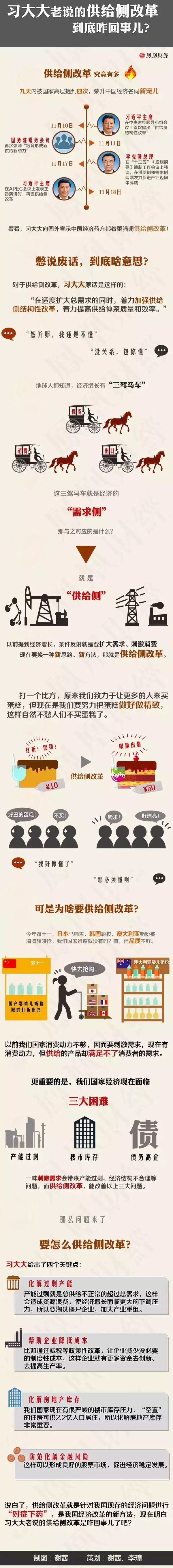 那么,這個新名詞到底是嘛意思呢?怎么才能更好地理解呢?該怎么改呢?和現在熱起來的“分享經濟”又是啥關系呢?這些都是今天要回答的問題。注意:這篇文章算是一個知識貼,不會太深奧,也不會太深刻。重在讓同學們了解這個詞的含義。要看深度的、學術的文章,網上一大把啊。感興趣的同學自力更生吧。 一、是什么? 來看張圖,直觀風趣。這里面用的是供給側改革這個說法,不是太嚴謹哦。同學們心中有數就行。 看完這張圖,應該大概都明白了吧?接下來咱們再來解釋解釋。 二、究竟是啥? 從理論源頭說起吧。 供給學派是上世紀70年代在美國興起的一個經濟學流派,強調經濟的供給方面,認為生產的增長決定于勞動力和資本等生產要素的供給和有效利用。在供給學派基礎上發展出新供給主義,主張通過放松供給約束,解除供給抑制,讓新供給創造新需求,才能提升經濟的潛在增長率。 如果將需求管理比喻為“西醫”,新供給所強調的供給管理更像是“中醫”。“西醫”可以救急,但副作用大。中醫療法如文火慢煮,綜合施治,需要把握火候,引出的味道也更濃。 供給側結構性改革,是強調在供給角度實施結構優化、增加有效供給的中長期視野的宏觀調控。未來我國推進新一輪經濟改革,應從國際主流的需求管理“西醫”方式,更自覺、更積極轉向供給方面的改革創新,防止對“西醫”過度依賴,采用“中醫為主、西醫配合”的供給管理與需求管理相結合的綜合療法。 面對經濟持續下滑,我國沒有再出臺大規模經濟刺激計劃,而是簡政放權,連續下放行政審批權,探索設立自由貿易區,激發市場內在活力,都能看到新供給理論的影子。 已故經濟學大師科斯說,經濟學的未來在中國。中國學者提出的新供給經濟學理論,或許已在正確方向上邁出了重要一步。(這部分內容摘自新華全媒頭條 文章,作者陳二厚,劉錚) 太學術了嗎?接下來看看清華大學教授孫立平最近拿包子舉的一個例子。很有意思。他是這么說的: “有一次去蕪湖。蕪湖有一家據說始建于光緒年間的包子鋪。一天早上,朋友帶我去那里吃包子,就聯想到現在人們討論的供給與需求的關系。經濟的現實是:把“包子”做出來了,但是賣不出去(通常說的內需不足或產能過剩)。 于是,從需求側做文章,號召人們買包子,并促進包子外銷。但從效果看,人們買包子還是不踴躍,而且外銷也基本飽和了。這意味著在需求側做文章的空間已經不大。 于是,目光轉到了供給側。一看供給側,問題來了。原來包子做的就有問題,好吃的包子很有限,無法下咽的包子做了一堆。 這樣,新的思路就有了。多做好吃的包子,少做或不做無法下咽的包子(即供給側改革,發展新興產業,提供適銷對路產品,去庫存,消滅過剩的產能)。” 這個已經說得很清楚了吧? 三、有啥經驗教訓? 前面提到了供給側結構性改革的理論源頭——“供給學派”。供給學派的誕生建立在反對凱恩斯主義的基礎上。凱恩斯主義的核心是注重需求側的管理,通過刺激需求達到經濟調控目的,其典型工具是貨幣政策。盡管凱恩斯主義被一再證明在短期內確實行之有效,但長期來看,一味擴大需求會導致持續通脹,進而導致經濟停滯。這正是里根和撒切爾夫人上世紀80年代在美、英上臺時面對的局面。 在當時的冷戰背景下,美英的通脹和經濟停滯具有格外的政治放大效應,因此引發了學界和政界的反思。供給學派針對凱恩斯主義的弊端,提出了通過提高生產能力促進經濟增長,而不是通過刺激社會需求促進經濟增長的主張?;谶@個基本認識,通過減稅提高全要素生產率,成為供給學派最鮮明的口號。 里根上臺后,于1981年將供給學派的主張結合貨幣學派的主張,一起運用到經濟管理中,并分解為削減不包括軍費在內的財政開支,對企業和納稅個人實施大規模減稅,減少對企業的干預,嚴格控制貨幣供應量等措施。這是“供給側改革”的**次大規模實踐。 從里根經濟學的實踐效果看,總體是正向的。里根時期,從1982年12月至1988年5月,美國經濟持續增長65個月,1984年,美國一度實現預算收支平衡。在此后的30年中,美國只在克林頓時期再次做到這一點。此外,美國的通脹率也由13.5%回落到低于5%。在更大的視野中,供給學派經濟思想占重要位置的里根-撒切爾主義,因為度過了經濟停滯危機而在冷戰后期與前蘇聯的對抗中占據了主動。 不過,雜糅供給學派和貨幣學派的里根經濟學,也有負效應。比如,減稅計劃導致里根執政期間赤字從一度平衡走向失衡,因為大企業受普遍減稅的益處更多,里根時期美國的貧富差距進一步拉大。 自克林頓時期以來,出于平衡赤字的考量,供給學派失去了實踐舞臺。2008年金融危機以后,全球主要經濟體重拾凱恩斯主義,著重用貨幣政策刺激需求。到今天,其弊端再次凸現:歐洲沒有因為貨幣刺激解決債務危機,日本“安倍經濟學”邊際效應遞減,貨幣戰隱患出現。這說明,無論哪種經濟思維,都不是放之四海而皆準的靈丹妙藥。這也意味著,中國新提出的“供給側改革”,必然要汲取國際實踐的經驗教訓,作出符合自身實際情況的詮釋。 美、英等國的供給學派思維實踐,盡管能為中國的“供給側改革”提供借鑒,但無論在內涵上還是路徑上都會有很大不同。 無論是供給學派、貨幣學派還是凱恩斯主義,在各國的經濟管理中都不可能單項使用。 上世紀80年代美、英