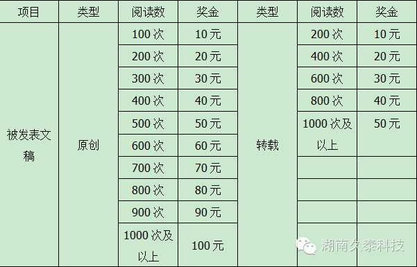 1.所有稿件可為原創,也可轉載;原創文章須自行整理成文,做到語句通順流暢、無錯別字,內容健康,文體不限,字數不限;轉載文檔不能侵犯他人文章版權。 2.所有稿件一經采納,將發布到微信公眾平臺按點擊率對發表人進行獎勵。點擊率僅指微信公眾平臺的點擊率。具體獎勵辦法如下:
