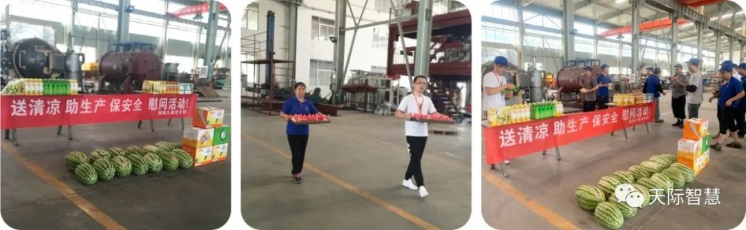 “送清涼 助生產 保安全” 慰問活動炎炎夏日送清涼 絲絲關愛暖人心 驕陽似火,酷暑難當,連日來的高溫天氣,考驗著奮戰在一線車間兄弟們的同時,也牽動著湖南天際智慧材料科技有限公司領導們的心。 為防止高溫中暑,傳遞公司對職工們的關愛,營造和諧的工作氛圍,公司黨支部開展以“送清涼 助生產 保安全”為主題的慰問活動,為車間兄弟們送去了降暑神器——藿香正氣水、西瓜以及解暑飲品等。 黨支部書記陽明帶領全體黨員一同組織此次活動,并在活動現場親自為同事們端來冰鎮西瓜,并把解暑飲品送到工作現場給予不能離開崗位的職工,大家臉上洋溢著燦爛的笑容,他們(黨支部)牢記使命,踐行初心。